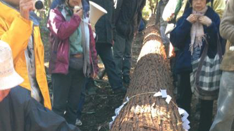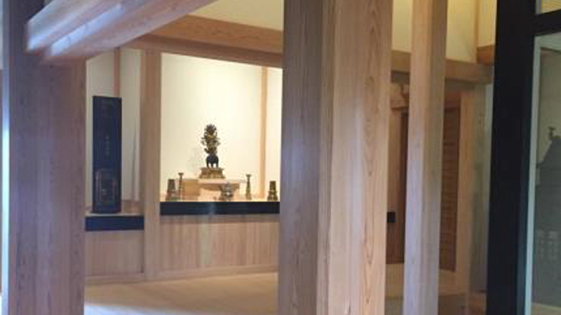 もう一つ、この空間を小田原の木材で小田原の職人によって実現したのは、当会の設立当初からの主張と第30回全国削ろう会を誘致したことが大きな弾みになったことは記しておきたいと思います。その中でも、削ろう会の為に小田原材のアピールも兼ね、天守の森と命名した辻村山林の200年生の杉を伐採したその木が、この摩利支天の空間に使われたことはこの上なく光栄なことです。(2013年11月30日に洋の東西を問わず昔から言い伝えられてきた新月の前に伐採し、葉枯らしする方法で天然乾燥しておいた。造作に際し棟梁がカンナの掛かりが良いと言っていた。伐採にあたってはNPO新月の木国際協会にご協力いただいた)